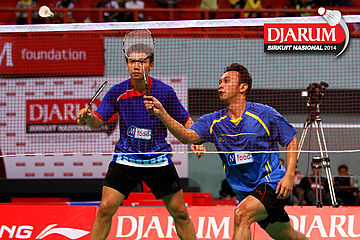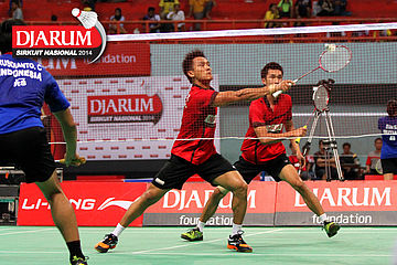 Afiat Yuris/Yohanes Rendy (PB Djarum) berhasil menghadang serangan yang dilepaskan pasangan Christopher Rusdiyanto/Tri Kusuma Wardhana (Jaya Raya Suryanaga).