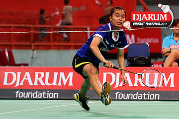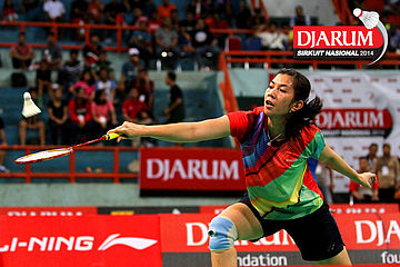Adriyanti Firdasari (Jaya Raya) mengembalikan shuttlecock ke arah Tike Arieda (Jaya Raya Suryanaga).