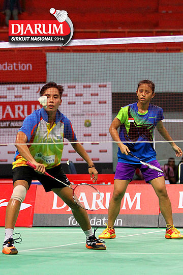 Aris Budiharti/Ery Octaviani (Jaya Raya) menyambut serve dari Dian Fitriani/Nadya Melati (Jaya Raya/Pertamina Indonesia).