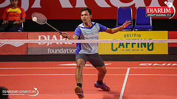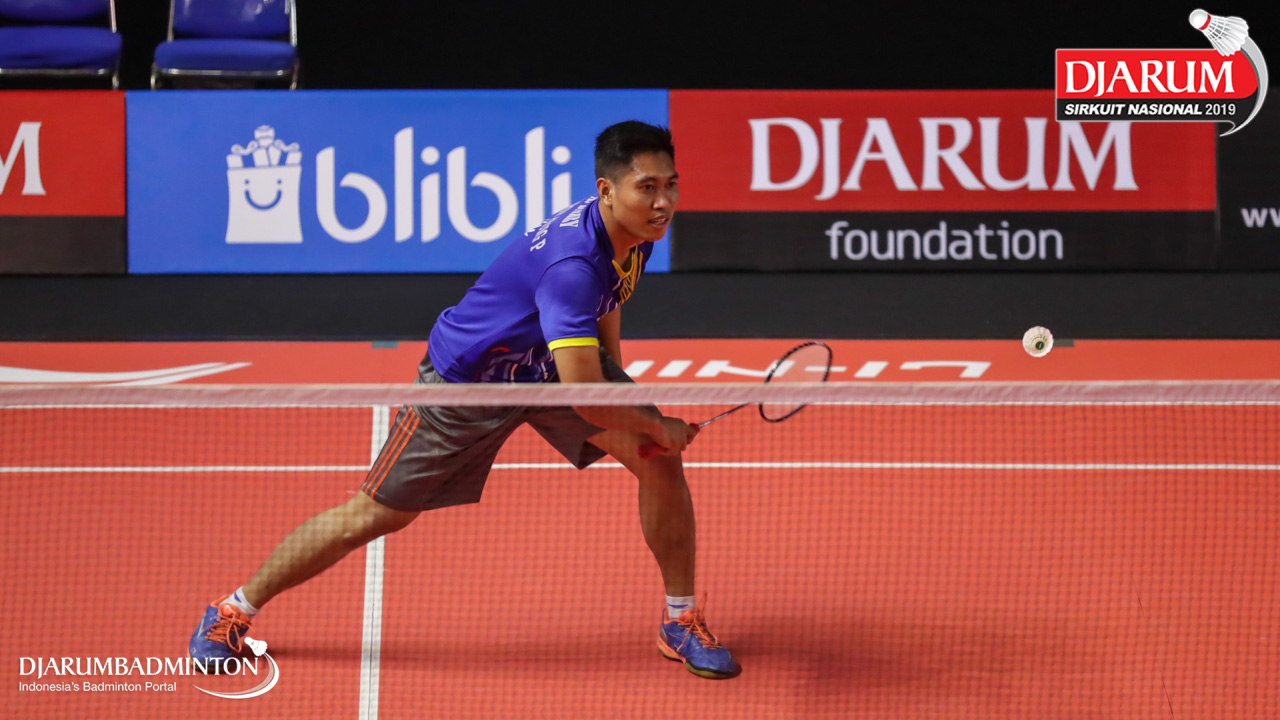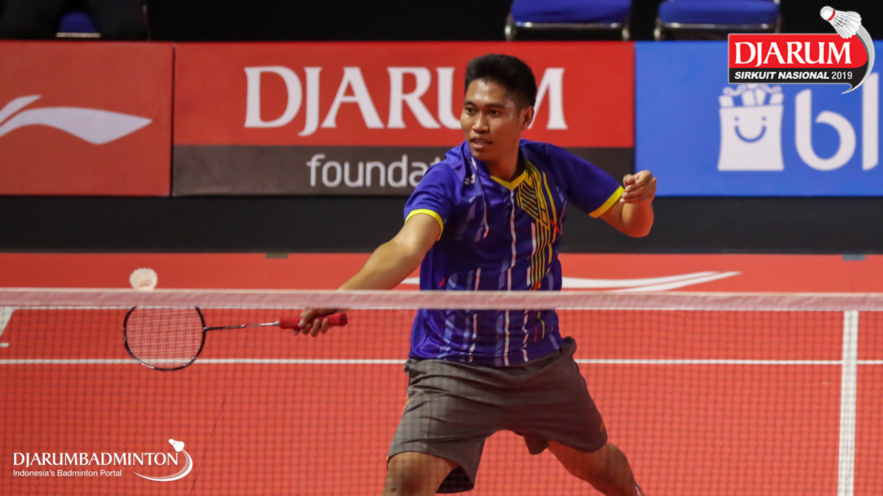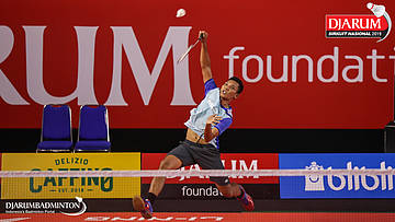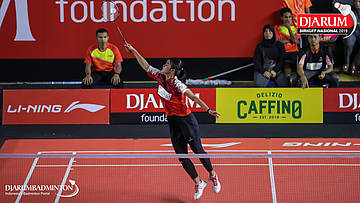 Wahyu Triansyah (Bank Sumsel Babel, Plb) bersiap menyambut shuttlecock