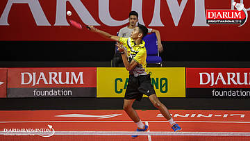 Abdul Kadir Zailani (Mutiara Cardinal, Bandung) bersiap menyambut shuttlecock