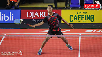 Jovi Michael (Focus Badminton Club, Jaksel) bersiap melepaskan serangan