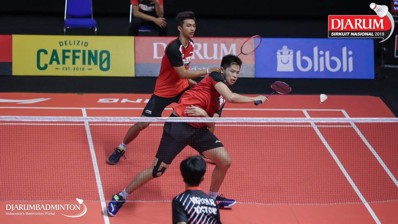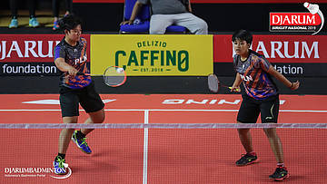 Ivan Adi Cahyono+Vincentius Suwarland (PB Djarum, Kudus) bersiap mengembalikan shuttlecock