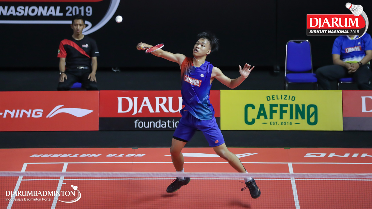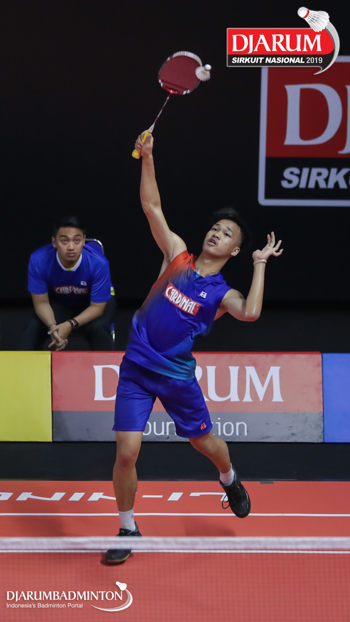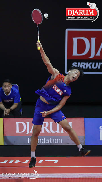 Yudha Putra Pramudia (Mutiara Cardinal, Bandung) menyambut shuttlecock