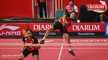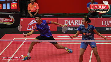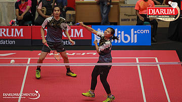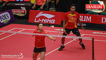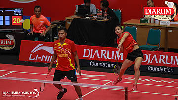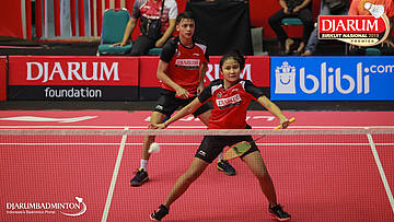 Asghar Herfanda+Sang Ayu Putu Kharisma Maharani (PB Djarum, Kudus) bersiap menggapai pengembalian