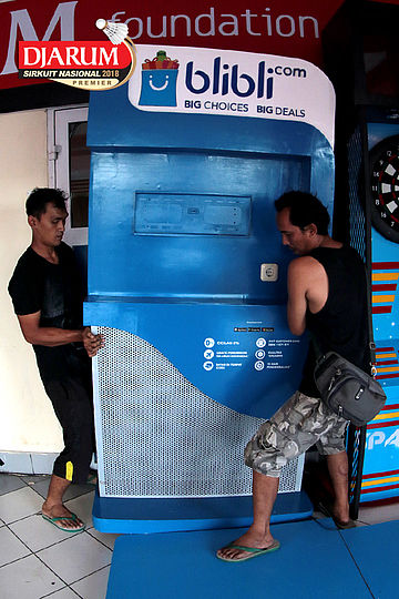 Salah Satu Petugas Saat Mempersiapkan Perangkat Logistik Djarum Sirkuit Nasional Premier Li-Ning Jawa Tengah Open 2018 Di Booth Blibli.com