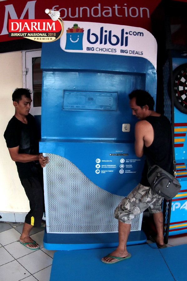 Dua Orang Pekerja Sedang Mempersiapkan Perangkat Logistik Djarum Sirkuit Nasional Premier Li-Ning Jawa Tengah Open 2018 Di Booth Blibli.com