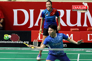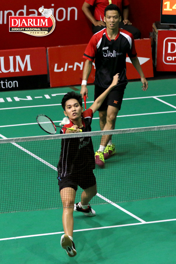 Lukhi Apri/Ririn Amelia (Djarum Kudus) Menghadang Serangan.