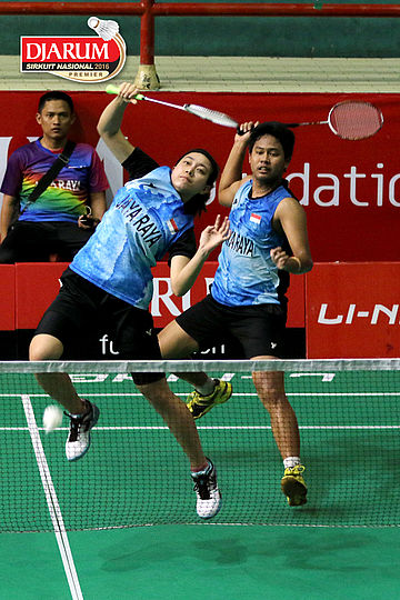 Fernando Kurniawan/Dian Fitriani (Djarum Kudus/Pertamina Fastron) Mengembalikan Shuttlecock.
