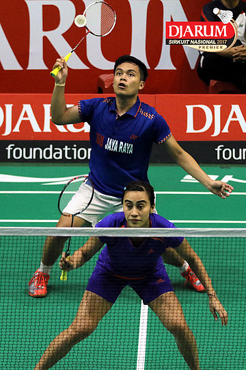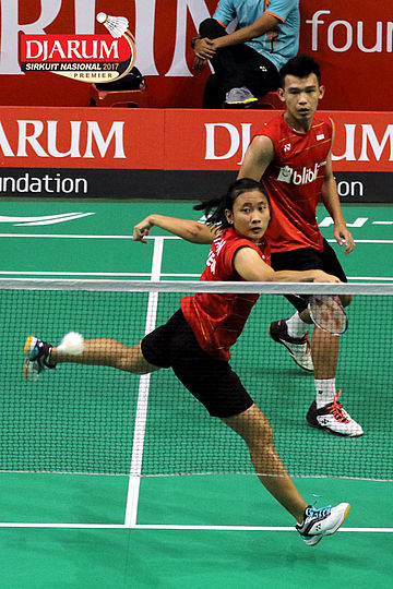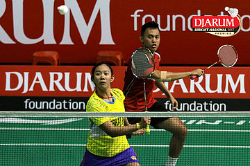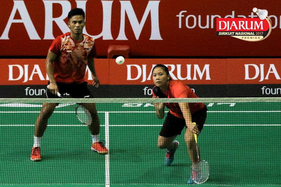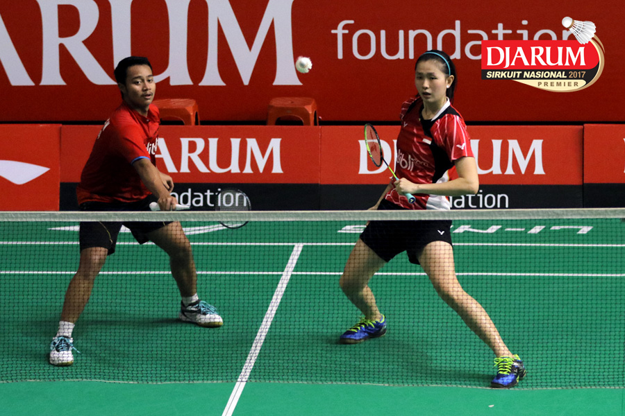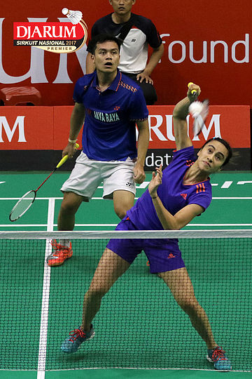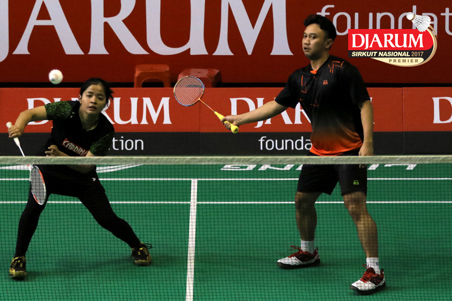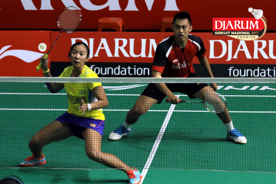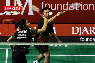 Tedi Supriadi/Devi Tika Permatasari (Djarum Kudus/Berkat Abadi) Mengembalikan Shuttlecock