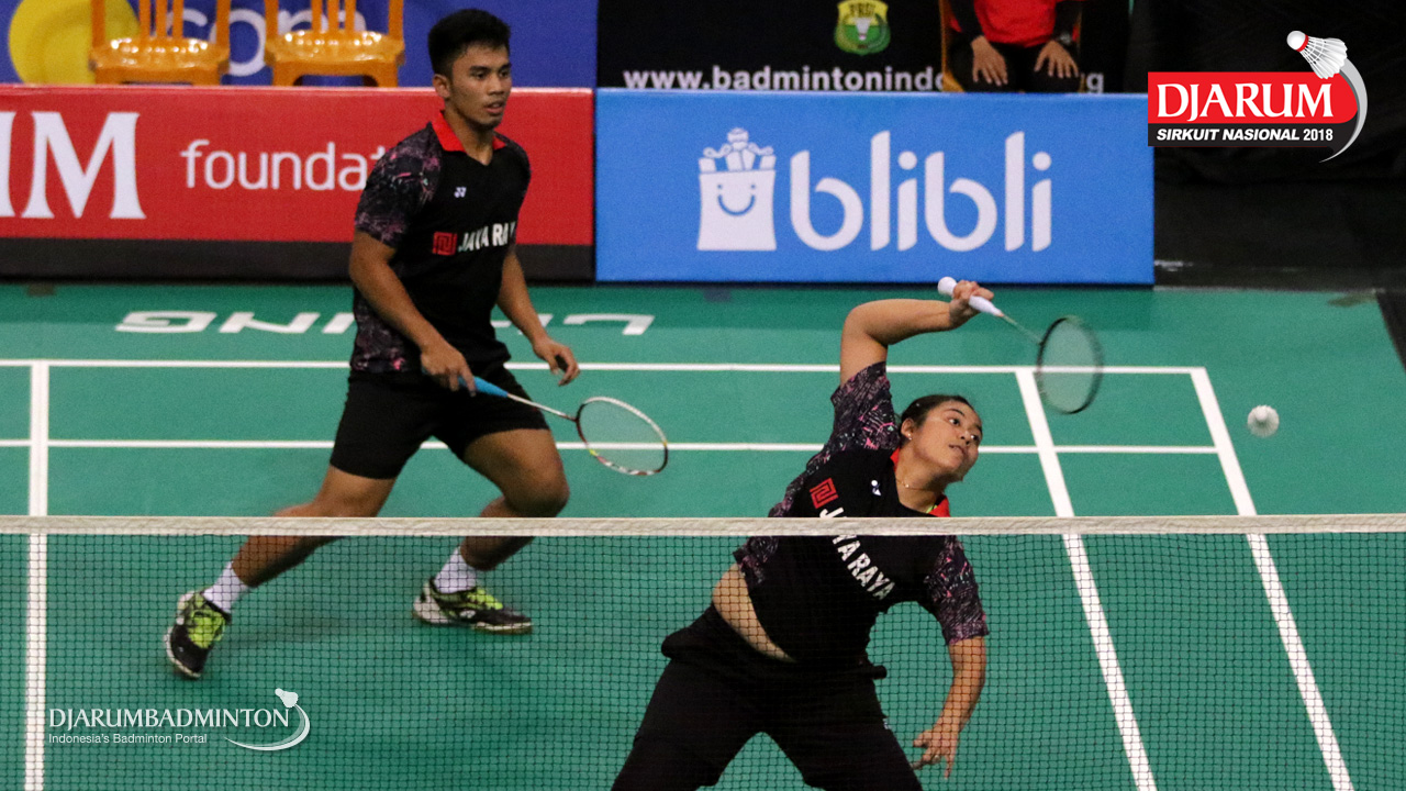 Reza Dwicahya Purnama/Annisya Widya Permatasari (Jaya Raya Jakarta/Mutiara Cardinal) bersiap menyambar pengembalian
