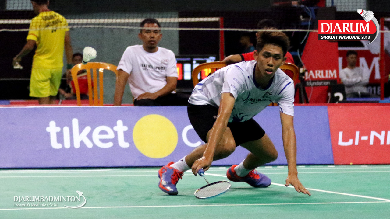Aldo Oktaviano Purnomo (Sakura Badminton) mengembalikan shuttlecock