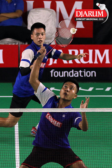 Angga Dian/M. Robby Darwis (Mutiara Cardinal) bersiap menyambar pengembalian tanggung.