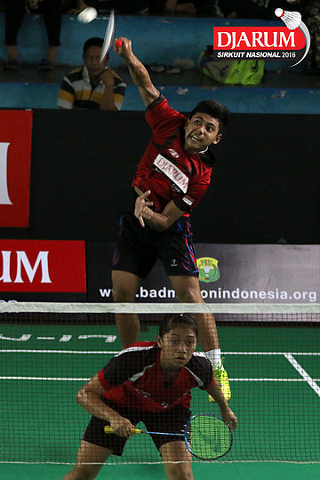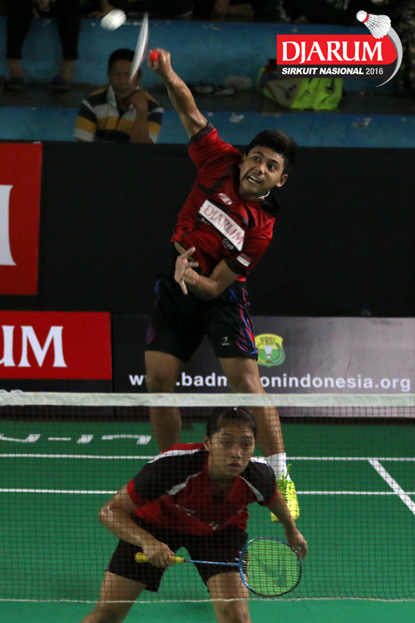 Bernadus Bagas/Indah Cahya (Djarum Kudus) melepaskan serangan.