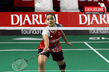 Choirunnisa (Mutiara Cardinal) mengembalikan shuttlecock.