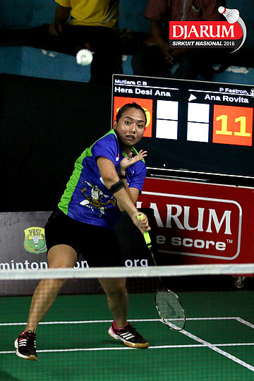 Hera Desi Ana (Mutiara Cardinal) mengembalikan shuttlecock.