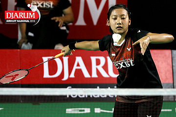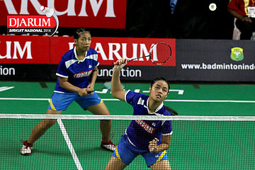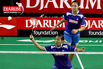 Indah Cahya/Lisa Ayu (Djarum Kudus) bersiap menyambar pengembalian.