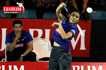 Bening Sri Rahayu (Exist) mengembalikan shuttlecock.