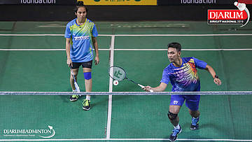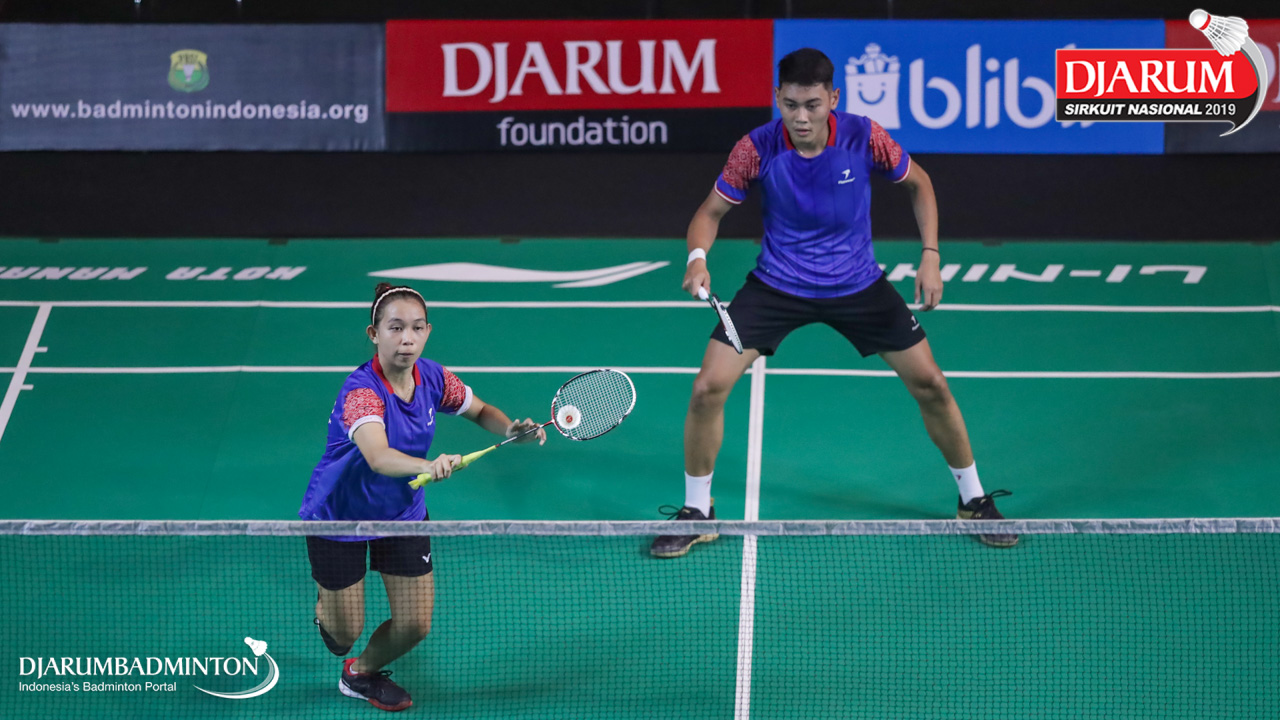 Joshua David Wardana+Tessa Anjali Karouw (Tangkas, Jaksel) bersiap menyambut shuttlecock