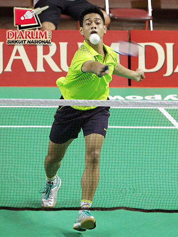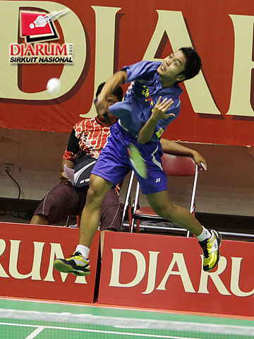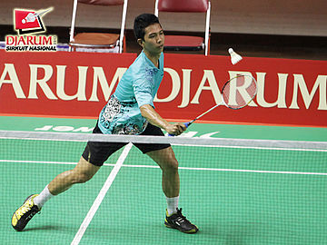 Kho Hendrikho (PB Djarum Kudus) melepaskan smash menyilang ke arah Abdul Muis (BKD Kaltim).