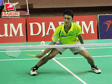 Saripudin (Candra Wijaya) bersiap mengembalikan shuttlecock ke arah Ihsan Maulana (PB Djarum Kudus).