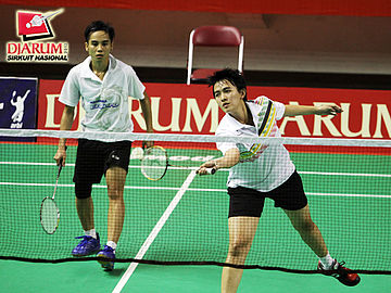 Pasangan ganda putra taruna PB Djarum Kudus, Kevin Ersa/Yantoni Edy saat menyambut serve dari pasangan Endico Harly/Hidayat Setiawan (Tangkas Specs).