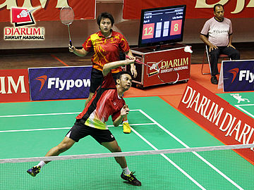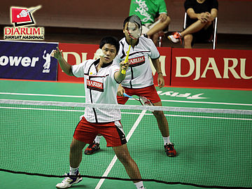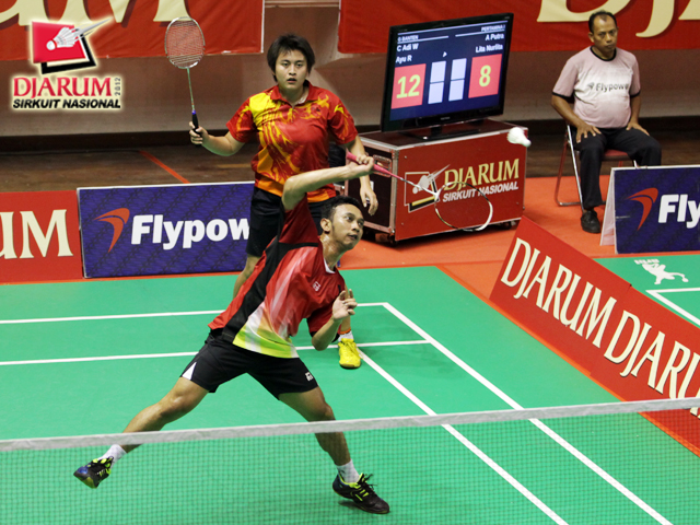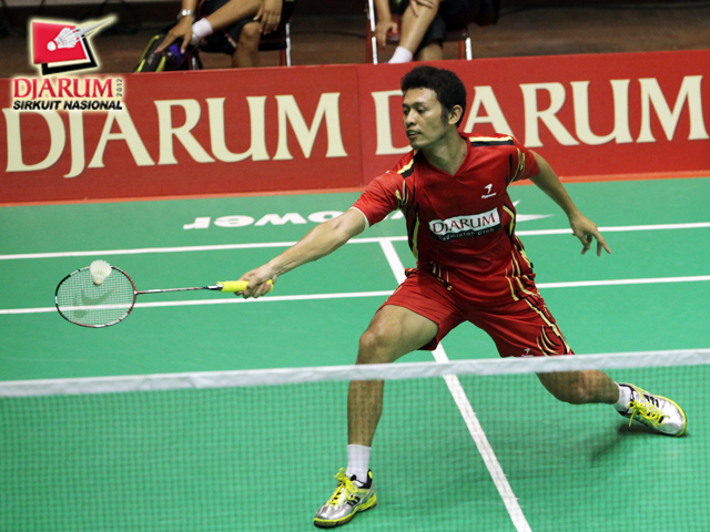 Andreas Adityawarman (PB Djarum Kudus) berusaha mengambalikan bola ke arah Alamsyah Yunus (Pertamina Indonesia).