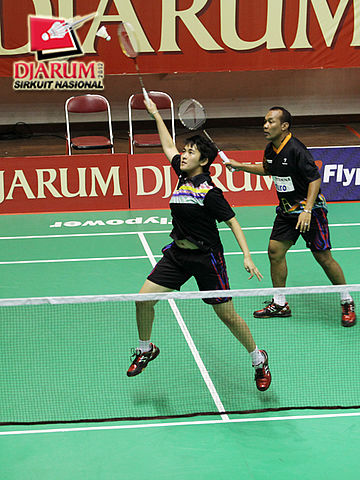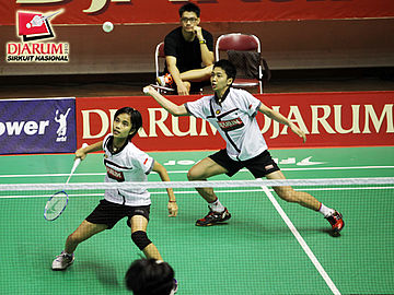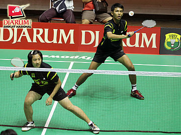 Fajar Alfian/Inten Ratnasari (SGS PLN) berhasil membaca smash menyilang yang dilepaskan pasangan Ricky Alverino/Febriani Endar (PB Djarum Kudus).