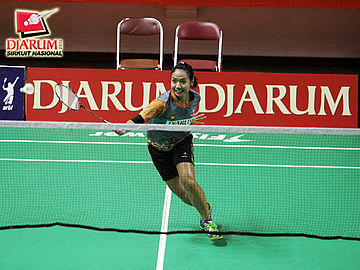 Dinar Dyah (PB Djarum Kudus) berhasil mengembalikan smash menyilang dari Ana Rovita (PB Djarum Kudus).