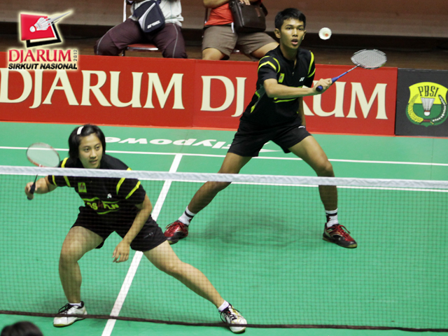 Pasangan Ricky Alverino/Febriani Endar (PB Djarum Kudus) bersiap mengembalikan bola ke arah Fajar Alfian/Inten Ratnasari (SGS PLN).