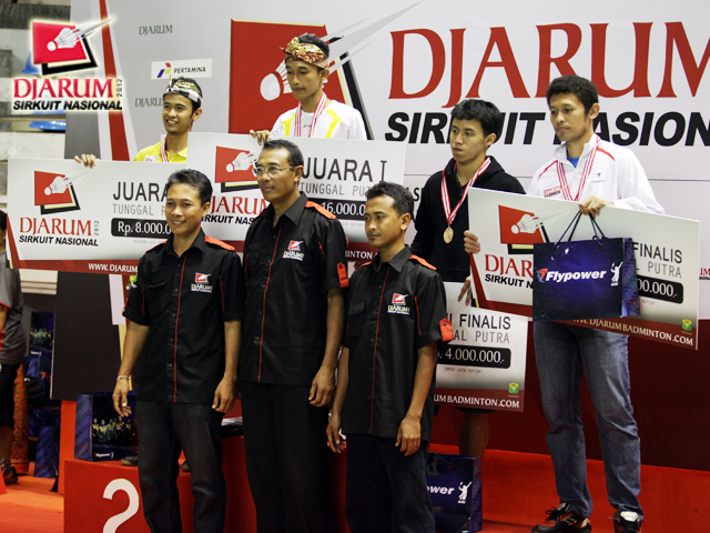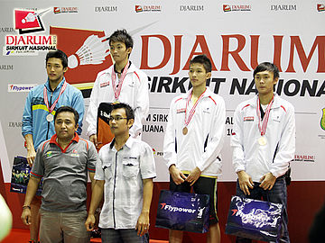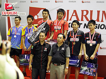 Juara kedua tunggal taruna putra, Jonatan Christine dari Tangkas Specs (kiri) bersama Ihsan Maulana, Bayu Pangisthu dan Rudi Cahyadi (PB DJarum Kudus).