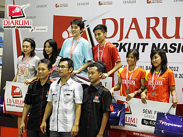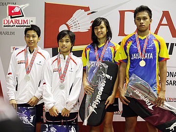 Juara pertama ganda campuran taruna asal Pusdiklat Jaya Raya, Rian Swastedian/Masita Mahmudin (kanan) berpose bersama juara kedua, Ricky Alverino/Febriani Endar (PB Djarum Kudus) usai pembagian medali.