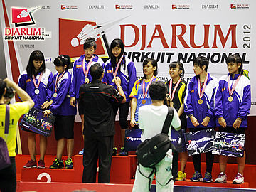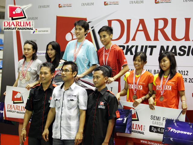Para juara kelompok ganda dewasa putri, Vita Marissa/Nadia Melati (tengah), Devi Tika Permatasari/Keshya Nurvita (kiri) dan Aris Budiharti/Dian Fitriani (Pusdiklat Jaya Raya) berfoto bersama.