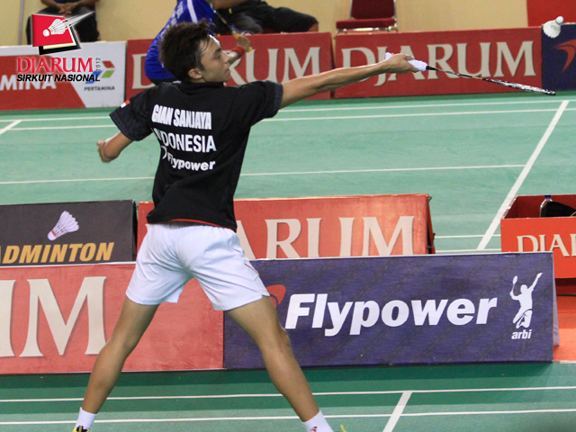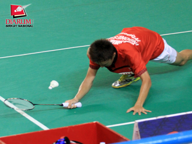 Pemain PB Djarum, Gian Sanjaya Putra terjatuh saat berusaha mengejar kok dari Taufan F. Adrianonta.