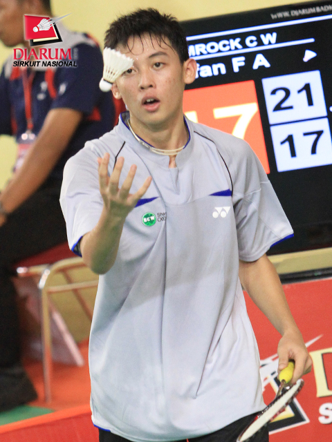 Pemain PB Djarum, Gian Sanjaya Putra sedang bersiap-siap untuk mengembalikan kok dari pemain Shamrock Candra Wijaya, Taufan F. Adrianonta.