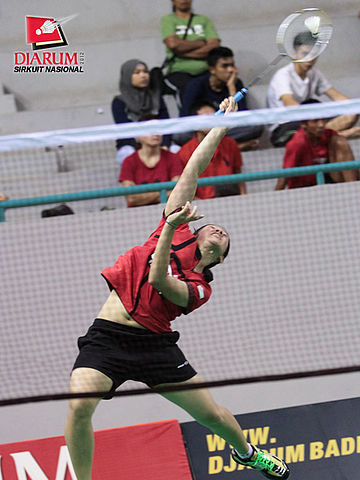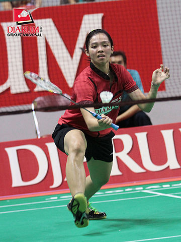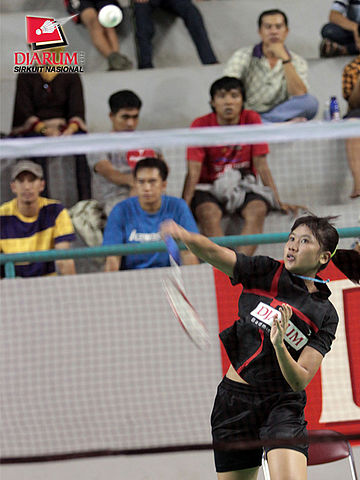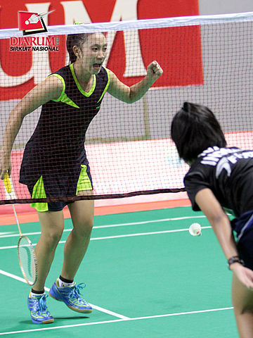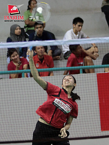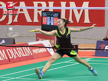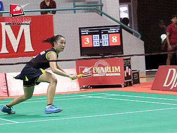 Natalie Deiske dari Tangkas Alfamart Jakarta sedang berusaha mengembalikan bola dari Ana Rovita, pemain PB Djarum. Dalam pertandingan babak kedua Tunggal Dewasa Putri tersebut, Ana keluar sebagai pemenang dengan perolehan poin 21-17/12-21/21-17.