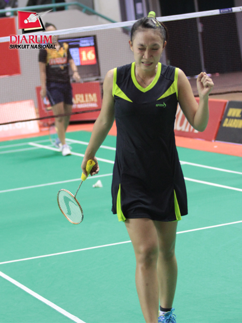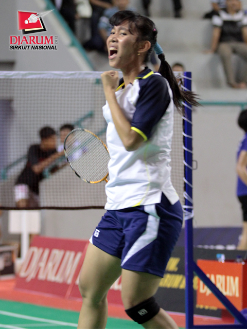 Ekspresi kebahagiaan Natalie Deiske (Tangkas Alfamart Jakarta) saat Ana Rovita (PB Djarum) gagal mengembalikan bola sehingga menambah poin untuk Natalie.