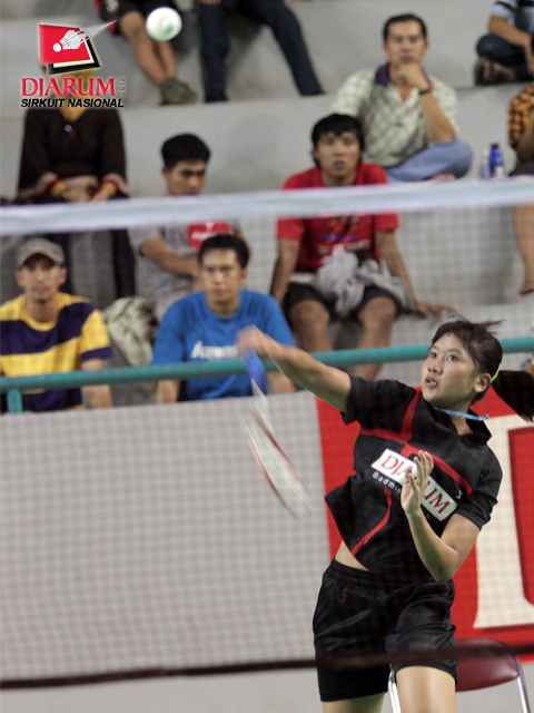 Febby Angguni dari PB Djarum sedang melakukan smash saat bertanding melawan Rusydina Antardayu dari Tangkas Alfamart Jakarta. Pada pertandingan tersebut, Febby menang 21-19/21-18 atas Rusydina.