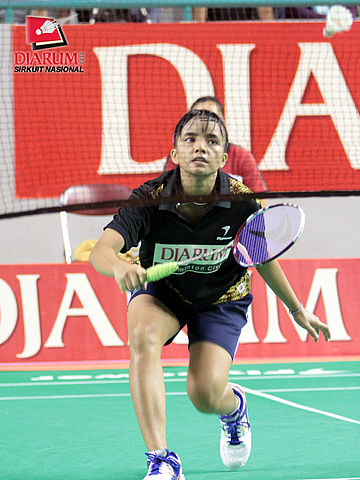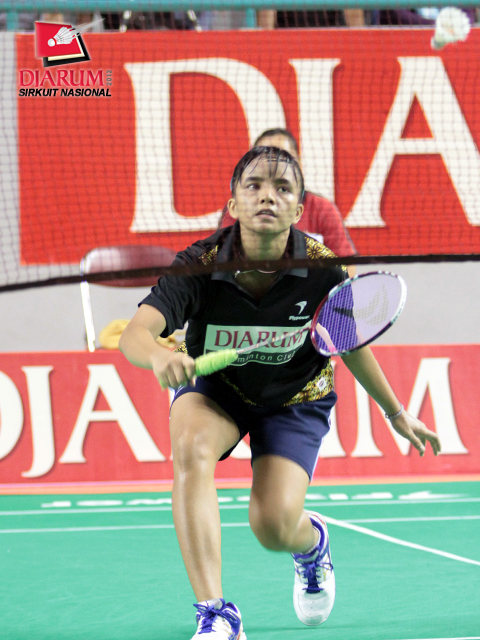 Pemain PB Djarum, Arinda Sari Singa berusaha mengejar kok saat bertanding melawan Setyana Mapasa dari Tangkas Alfamart Jakarta.