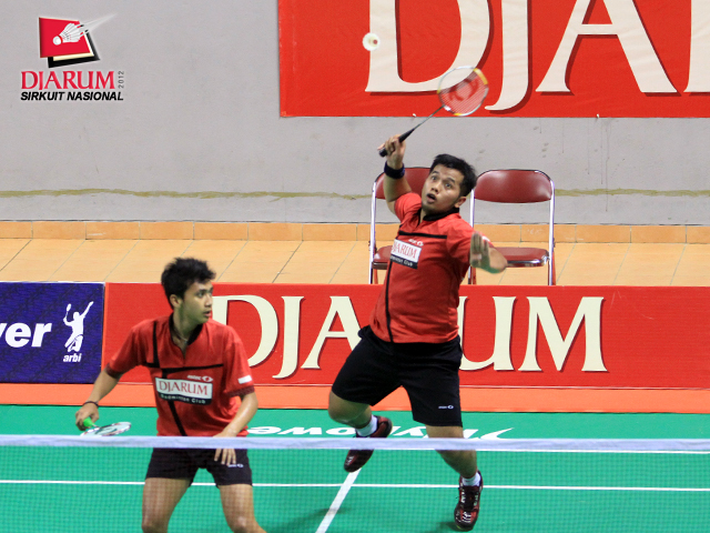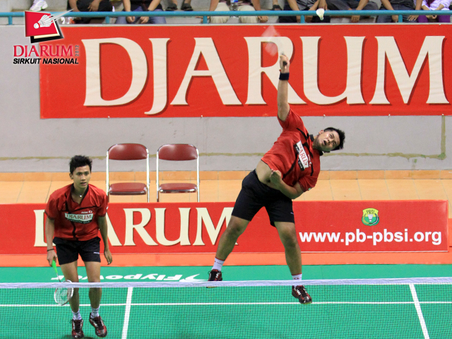 Wifqi Windarto (depan) yang berpasangan dengan Dandi Prabudita (belakang) asal PB Djarum melakukan smash ke arah pasangan Adi Haryanto/Siqid Sudrajad asal PB Djarum. Wifqi/Dandi keluar sebagai juara dengan skor akhir 21-23, 21-17, dan 22-20.