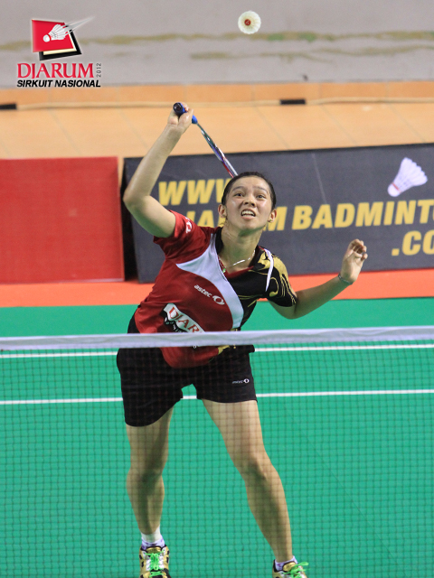 Pemain PB Djarum Febby Angguni sedang bersiap-siap untuk mengembalikan kok dari pemain Mutiara Bandung Hanna Ramadini.