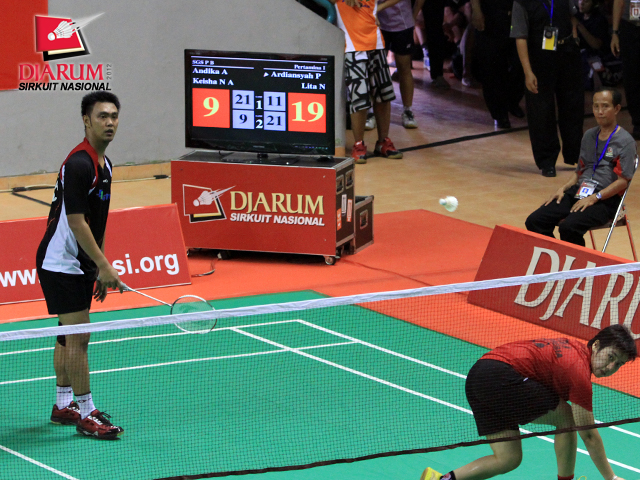 Pasangan Ardiansyah Putra/Lita Nurlita dari Pertamina Indonesia dalam babak ketiga rubber set saat melawan pasangan Andika Anhar/Keisha Nurpita Anadia dari SGS PLN Bandung di partai final Djarum Sirkuit Nasional Sumatera Selatan Open 2012.