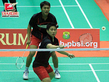 Rizki Yanu Kresnayandi yang berpasangan dengan Albert Saputra (Djarum Kudus) sedang memukul kok untuk dikembalikan kepada pasangan dari Jepang, Komacia/ Susuki.