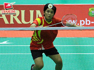 Lya Ersalita (Pusdiklat Jayaraya) siap memukul kok untuk dikembalikan kepada Arinda Sari Sinaga (Djarum Kudus).