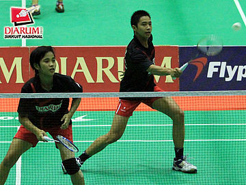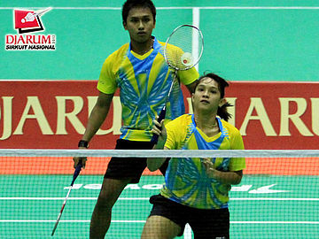 Ricky Alverino Sidharta yang berpasangan dengan Febriani Endar Kusumawati (Djarum Kudus) sedang mengembalikan kok kepada pasangan Aldo Abdillah/ Desaula Gendy dari Pusdiklat Jaya Raya.