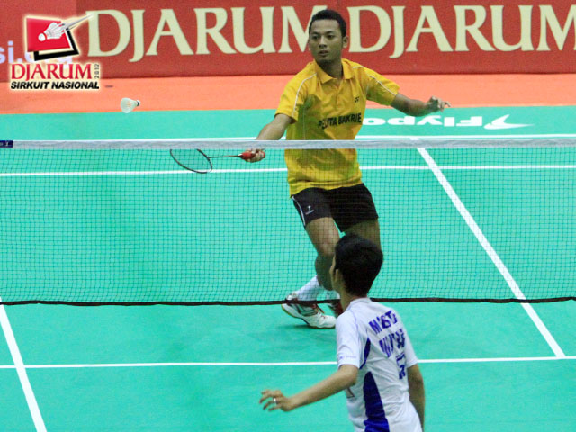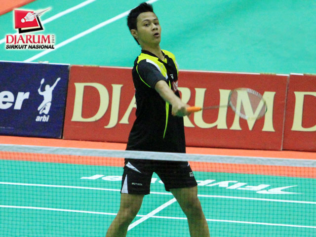 Mochamad Gustaf Firdaus (Mutiara Bandung) sedang mengembalikan kok kepada Rifan Fauzin Ivanudin (Pelatprov DKI).