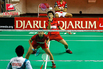 Andre Pinstikaa/Tutut Novi (PB Djarum) berhasil menghadang dan mengembalikan shuttlecock ke arah pasangan Lilik Sugianto/Linda Eva (Jaya Raya Metland/Citra Raya Unesa).
