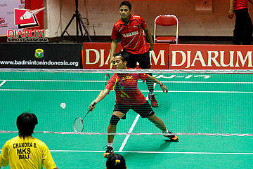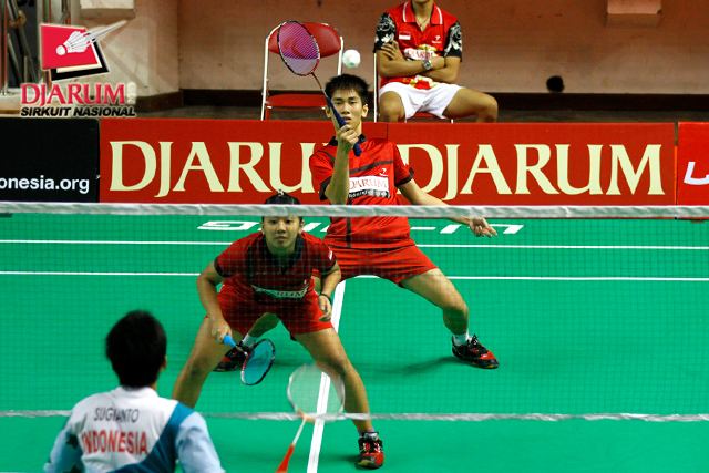 Calvin Ryan Mamonto (PB Djarum) mengembalikan shuttlecock ke arah M. Ahdial (Pelatprov DKI Jakarta).
