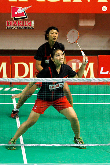 Mychelle Crhystine/Rofahadah Supriadi (PB Djarum) bersiap megembalikan shuttlecock ke arah Dianita Saraswati/Yulfira Barkah (Mutiara Bandung).