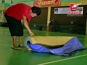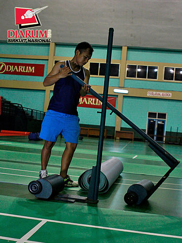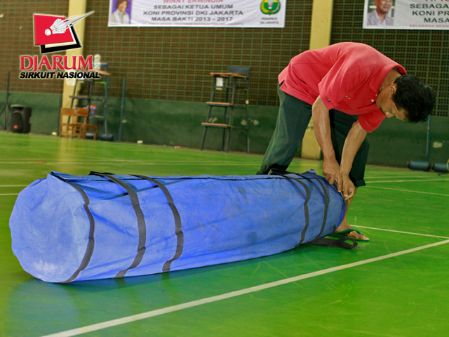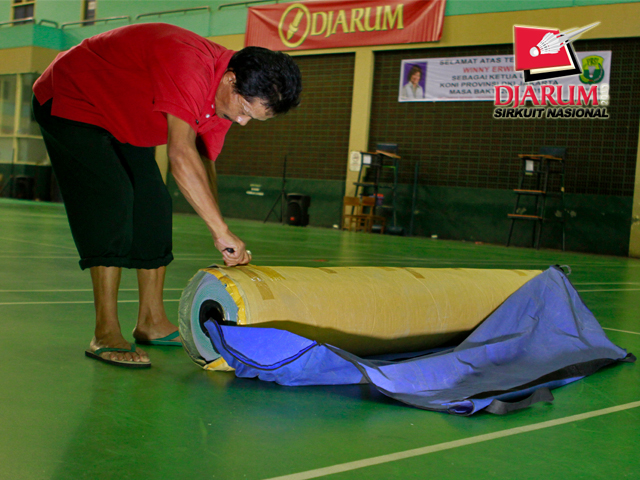 Seorang pekerja sedang mempersiapkan karpet lapangan di Hall Bulutangkis Asia Afrika.